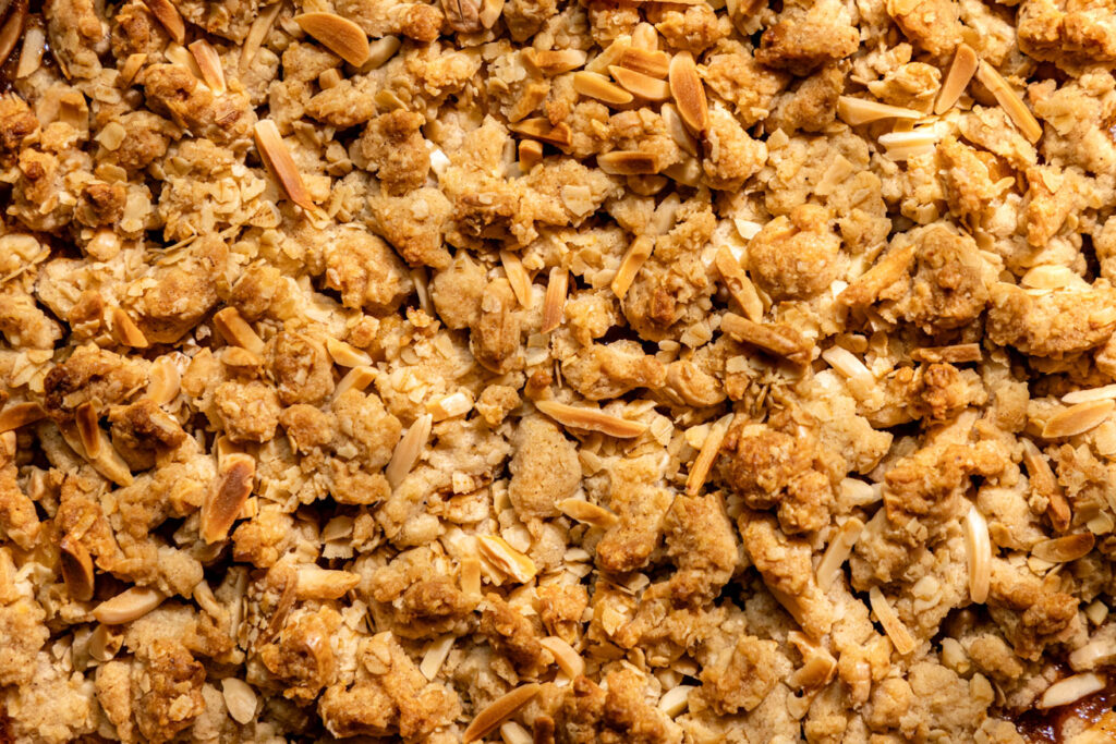 Nesta versão, acrescentei dois ingredientes que não fazem parte do clássico crumble: os flocos de aveia e a amêndoa. Desculpem-me os puritanos, mas acho que neste caso os fins justificam os meios. Estes dois fazem com que o nível de crocância suba de patamar e, portanto, é tudo o que se quer. Já para não falar que se torna mais nutritivo. (Quando se fala em sobremesas, todas as desculpas são válidas para pesar menos na consciência, não é verdade?)