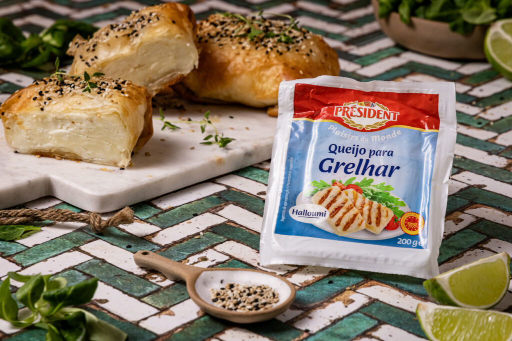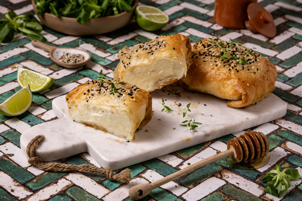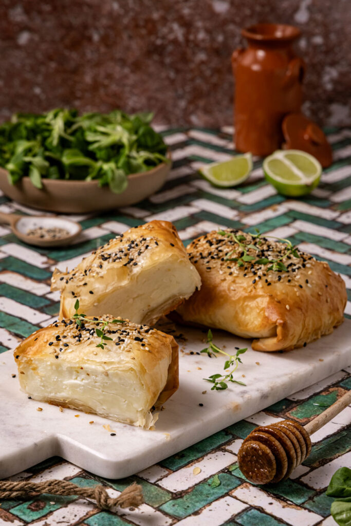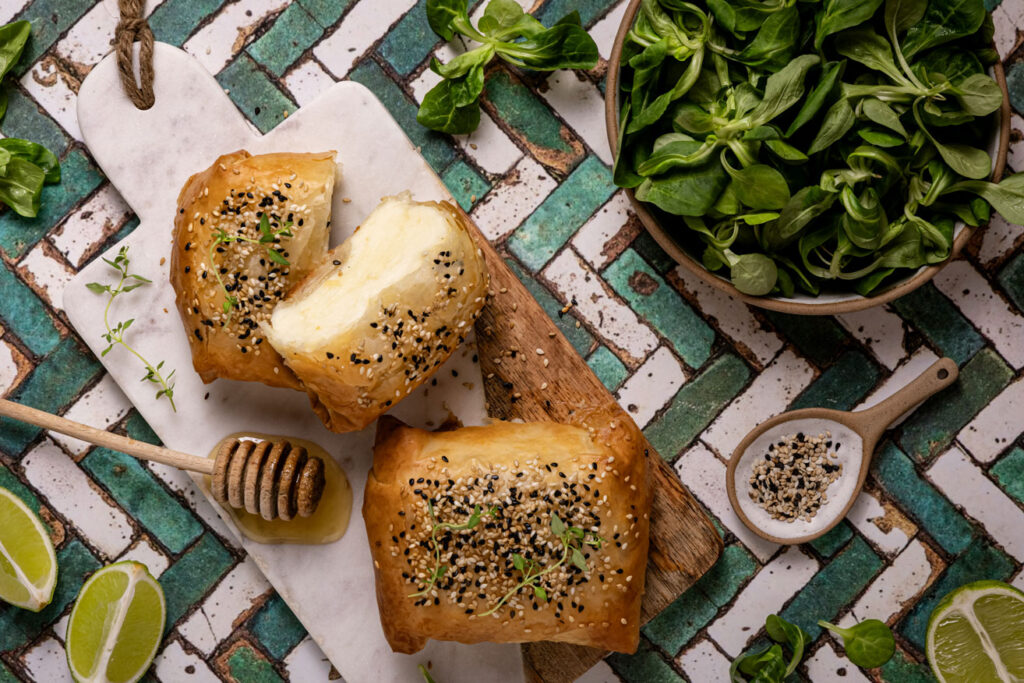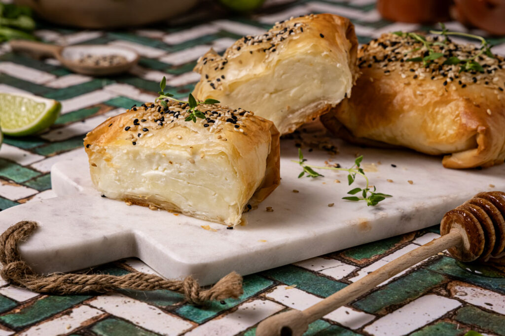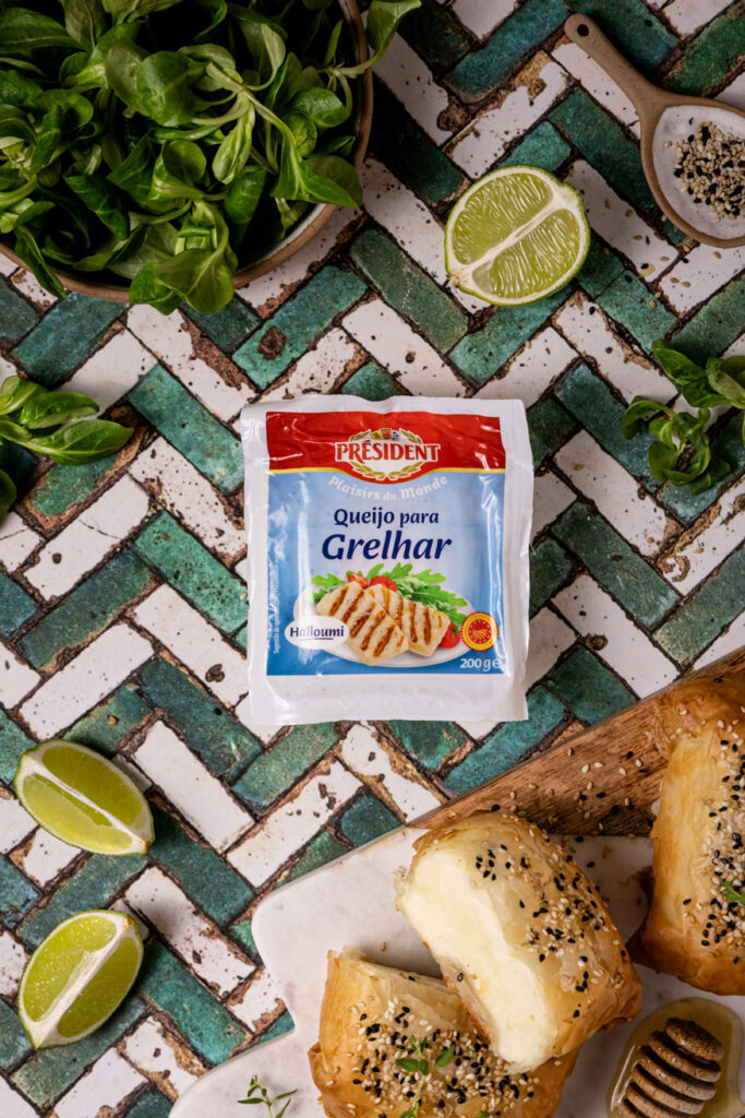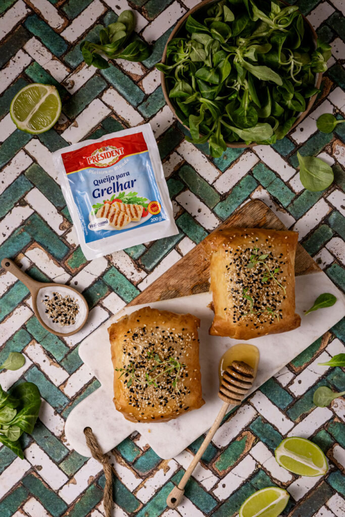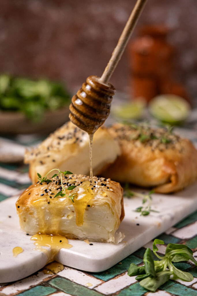 Num folhado, isso transforma tudo. Quando sai do forno, o aroma é simplesmente impossível de ignorar. A massa filo fica leve e crocante, enquanto o halloumi lá dentro aquece, intensifica o sabor salgado e cria aquele contraste irresistível entre estaladiço e cremoso. Se a tudo isto juntarmos um fio generoso de mel, imaginamos logo as pupilas gustativas aos saltos em êxtase.