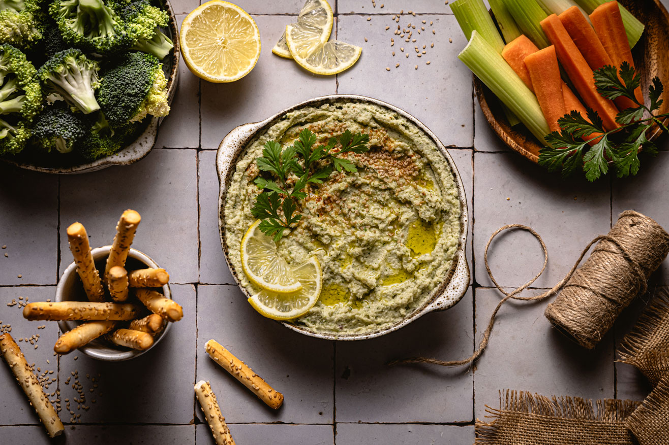 E já que o tempo quente se torna convidativo para refeições mais leves, trago como sugestão um petisco de origem árabe. O húmus, que galgou fronteiras e se tornou popular também no Ocidente, é tradicionalmente composto por uma pasta à base de grão-de-bico aromatizada com sumo de limão, sementes de sésamo e azeite. Nesta versão, como é fácil de adivinhar, a leguminosa dá lugar aos talos dos brócolos. A receita é muito prática de fazer, não requer grandes habilidades culinárias e o resultado é um creme muito versátil, perfeito para enriquecer wraps e sanduíches ou como dip para mergulhar pão pita, tostas ou vegetais crus como talos de aipo, palitos de cenoura ou pepino.